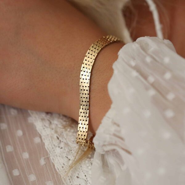 Dette murstensarmbånd i 14 karat guld har et markant og klassisk udtryk, kendetegnet ved det karakteristiske ledmønster. Designet giver armbåndet en solid og eksklusiv fremtoning, som samtidig er tidløs og let at bære. Med sin brede udførelse fungerer armbåndet flot alene og kræver ikke yderligere smykker for at stå stærkt. Det er et smykke, der udstråler kvalitet og giver en tydelig fornemmelse af tyngde og håndværk.