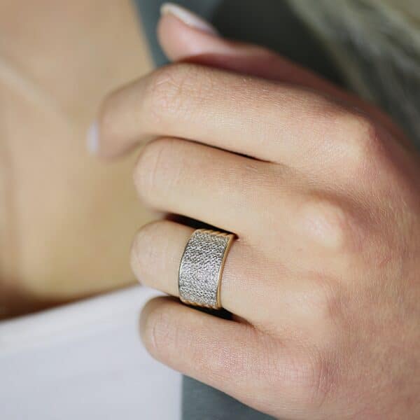 Denne ring i 14 karat guld er designet med et enkelt og klassisk udtryk, hvor de isatte diamanter tilfรธjer et diskret og elegant lys. Den solide guldbรฅndsprofil giver ringen en behagelig tyngde, og kombinationen af materialer gรธr smykket velegnet til bรฅde daglig brug og mere formelle anledninger. Ringen fremstรฅr i helt perfekt stand og bรฆrer det originale stempel, som bekrรฆfter รฆgtheden af guldet.