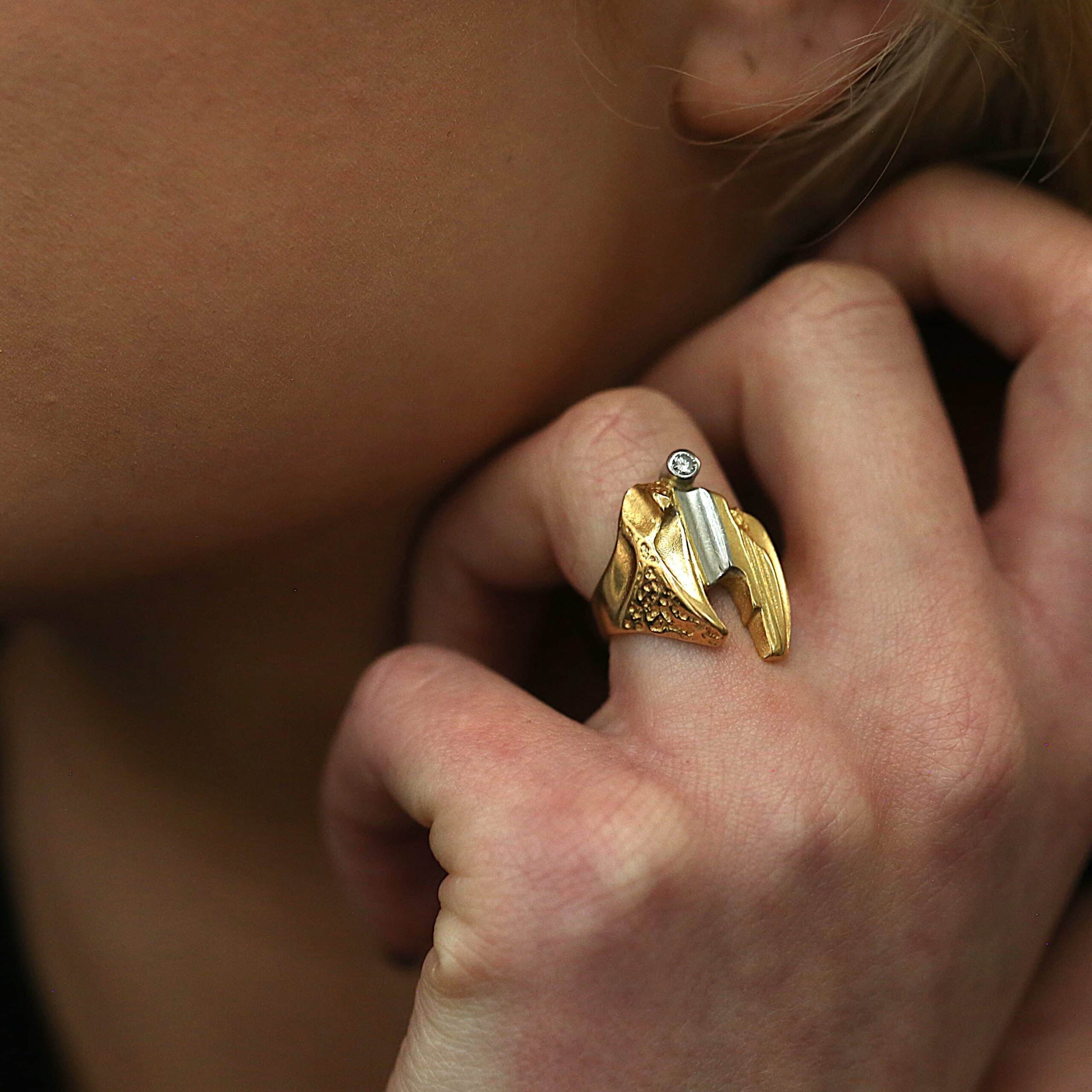 Ring i 18 karat guld fra Lapponia, et ikonisk smykke kendt for sit skulpturelle og kunstneriske formsprog. Lapponia-designs er inspireret af naturens rå linjer og organiske former, og denne ring er ingen undtagelse. Den unikke struktur kombineret med en funklende diamant skaber et markant og eksklusivt udtryk, der gør ringen til et lille kunstværk i sig selv. Smykket fremstår i perfekt stand og bærer tydeligt præg af Lapponias karakteristiske kvalitet og håndværk.
